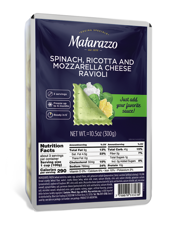 PASTA (wheat semolina, water, egg, spinach flakes, salt, potassium sorbate (preservative), [beta]-carotene (artificial coloring)). FILLING (bread crumbs (wheat flour, water), ricotta cheese (whey, whole milk, cream, calcium chloride, citric acid, sodium chloride, potassium sorbate (preservative)), soybean oil (soybean, BHT, citric acid), water, Mozzarella cheese (pasteurized milk, lactic acid bacteria, calcium chloride, salt, microbial rennet), spinach flakes, salt, parmesan cheese (pasteurized milk, lactic acid bacteria, calcium chloride, salt, microbial rennet), dehydrated onion, garlic powder, nutmeg, pepper, artificial flavoring, glucono delta-lactone (acidity regulator). Contains: Wheat, Egg, and Milk. May contain soy.